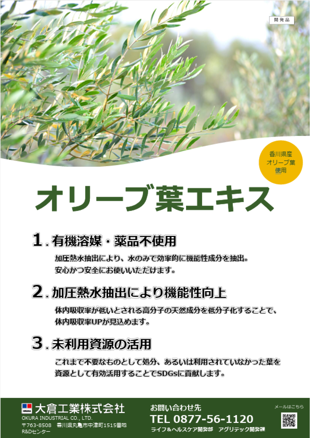 これまで不要なものとして処分、あるいは利用されていなかったオリーブ葉を原料として有効活用し、加圧熱水抽出により、水のみで機能性成分であるヒドロキシチロソールを抽出したエキス