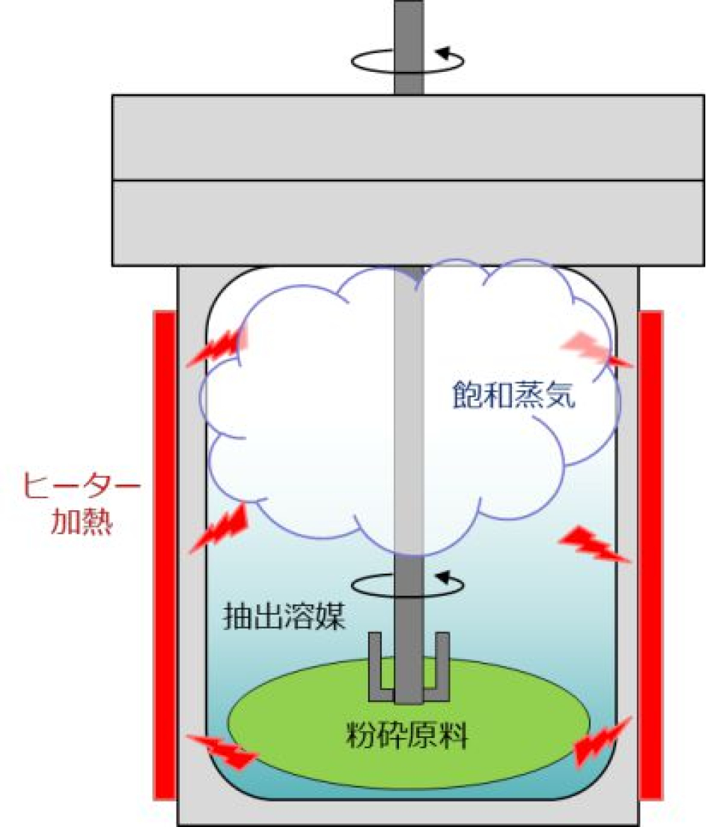 ● 圧力容器に原料と抽出溶媒を入れて密封し加熱することで容器内部の圧力が上がり、飽和蒸気圧状態となる