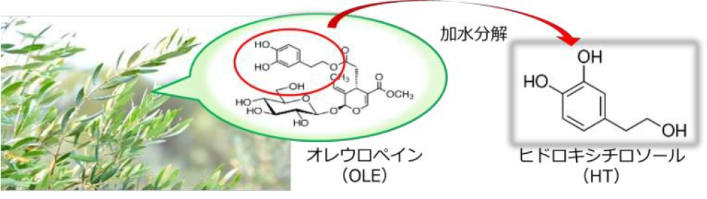 廃棄されているオリーブ剪定葉を原料として使用しています。オレウロペインというポリフェノールを加圧熱水抽出により加水分解して、低分子のヒドロキシチロソールを効率よく抽出したエキスを開発しました。