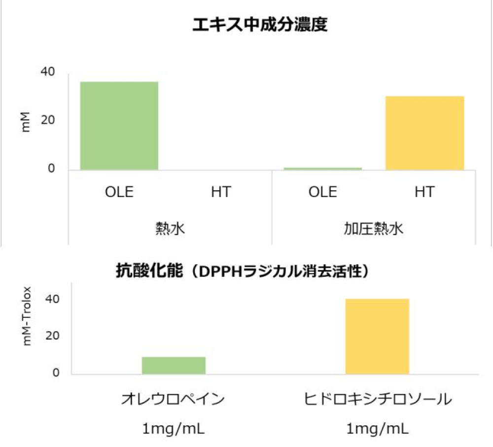 これまで不要なものとして処分、あるいは利用されていなかったオリーブ葉を原料として有効活用し、加圧熱水抽出により、水のみで機能性成分であるヒドロキシチロソールを抽出したエキス