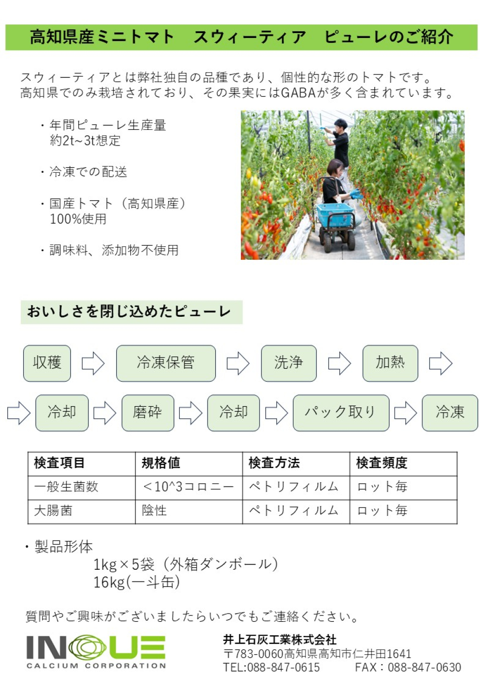 フルーティーな甘みと香りが際立つトマト、「乙女の涙」をまるごと贅沢に使用したトマトピューレです。 乙女の涙は弊社のオリジナルトマト品種である「スウィーティア」のブランド名です。 高知県の限られた地域のみで栽培しており、ユニークで希少性の高いトマトとしてご評価いただいております。 その乙女の涙を、余すことなく丸ごとピューレにいたしました。 調味料や添加物を一切使用していないため、乙女の涙の甘みや風味をそのままご活用いただけます。 さらに、リラックス成分としても注目される成分「GABA」を豊富に含んでおり、健康志向の付加価値提案にもご活用いただけます。